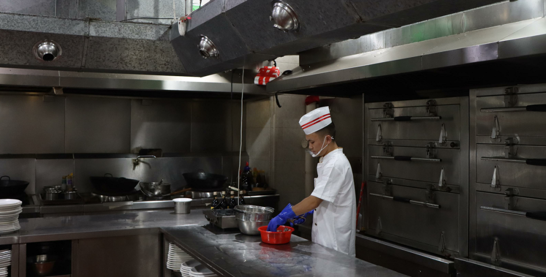 日前,记者走进长乐区江田镇某餐饮商户看到,后厨干净明亮,工作人员穿戴整洁,操作流程规范有序。