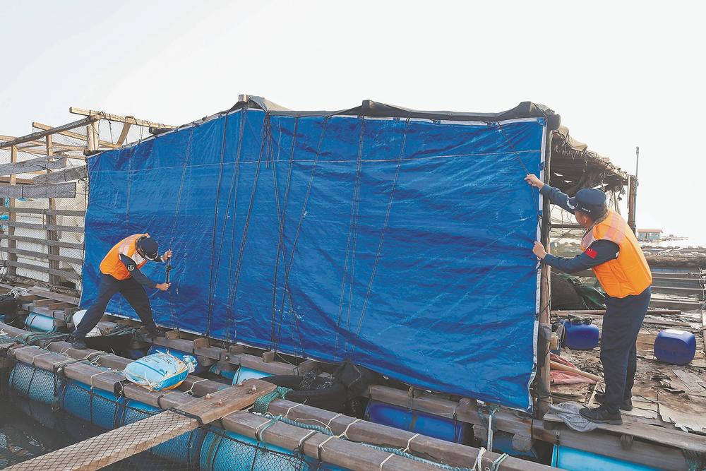 今年第14号台风“小犬”于5日8时20分前后以强台风级在台湾省屏东县鹅銮鼻登陆,登陆后减弱西行。作为秋台风,“小犬”给我省带来风雨影响,尤其在风的方面较为突出。日前,漳州海警局执法员赴辖区各重点海域,开展防台风宣传和安全检查。图为漳州海警执法员在帮助渔民固定渔排天遮。