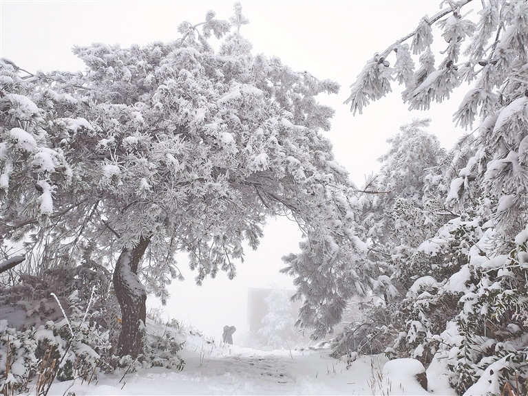 隆冬时节,坑底乡长岗头别有一番景致。一片雾凇奇景映入眼帘,仿佛踏入了一个被时间遗忘的冰雪王国。在雾凇装点下,满山树木银装素裹,吸引了大量游客前来观光、摄影。