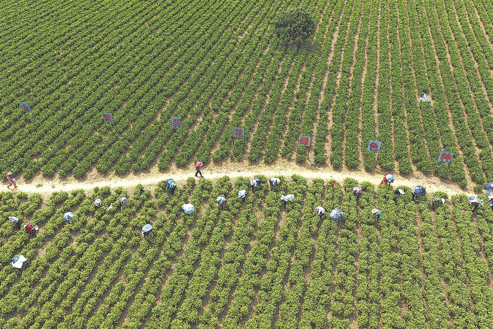 近日,福州市闽侯县竹岐乡苏洋村茉莉花基地,近200亩茉莉花田次第进入采摘期,农民抢抓农时采花、制花茶,供应市场。图为农民在茉莉花田里采花。