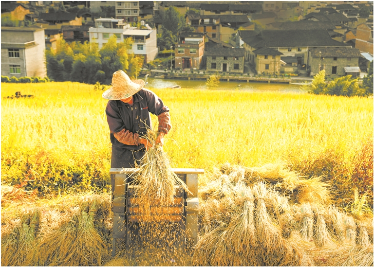 村民打稻谷