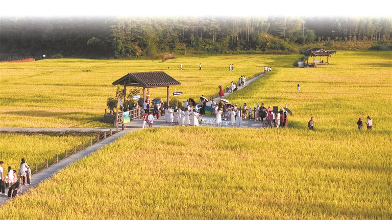 寿山乡白玉村也走出“稻田+”的新路子。秋日的白玉村,百亩稻田一片金黄,吸引大批游客慕名而来。游客们或走进稻田打卡拍照,或在露营基地小憩,享受乡村慢时光。