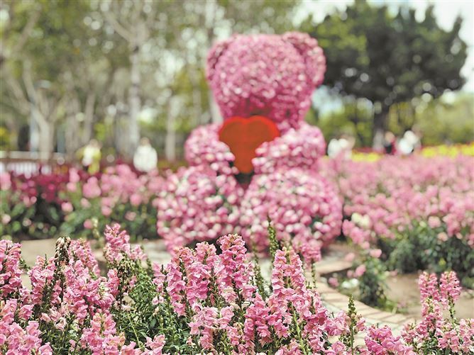 今年元宵期间,厦门园博苑春日繁花盛绽,海洋岛的5300平方米金鱼草花海五彩斑斓,花朵打造的爱心小熊造型成了打卡网红点。同期绽放的还有16万株波斯菊,白、粉、玫红交织如梦如幻。