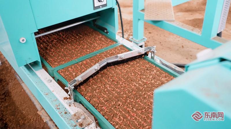 2月28号,记者走进建阳水吉镇吉丰农机专业合作社的育秧工厂,伴随着机器的轰鸣声,一条崭新的自动化育秧生产线正在高效运转,一个个空秧盘被整齐地放上传送带,经过机器时,它们自动完成了铺土、洒水、精密播种、二次洒水、覆土等一系列工序。生产线末端,一只灵活的智能机械臂格外引人注目,它精准地将播好种的育秧盘抓取起来,整齐地叠放成垛,等待工人转运至暗化室催芽。