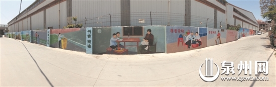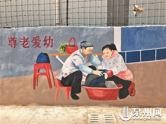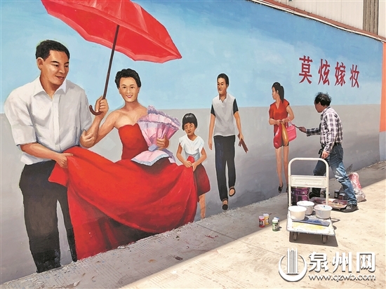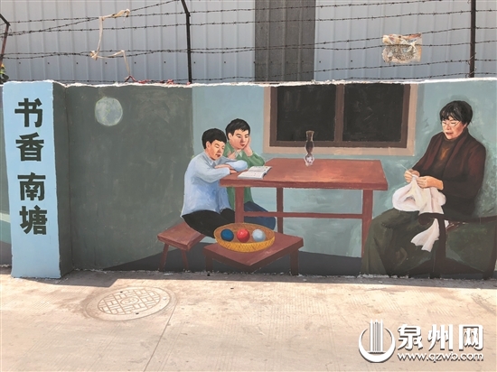 “莫炫嫁妆、婆媳和睦、尊老爱幼……”走在晋江新塘街道南塘社区的村道上,便可看到墙壁上一幅幅生动形象、内容丰富的彩绘壁画。这是社区居民龚喜庆在过去4个月里,构思创作的50多幅壁画,以“留住乡愁”为主题,既生动展现了村庄的原始面貌和村民生活,又通过群众喜闻乐见的方式,将传统习俗和现代文明礼仪等表现出来,成为南塘社区创建晋江市最美乡村中一道独特的风景线。