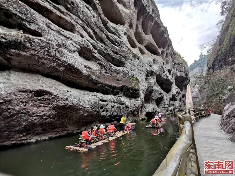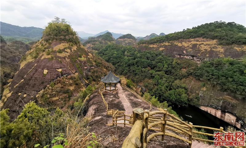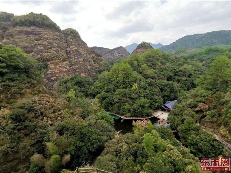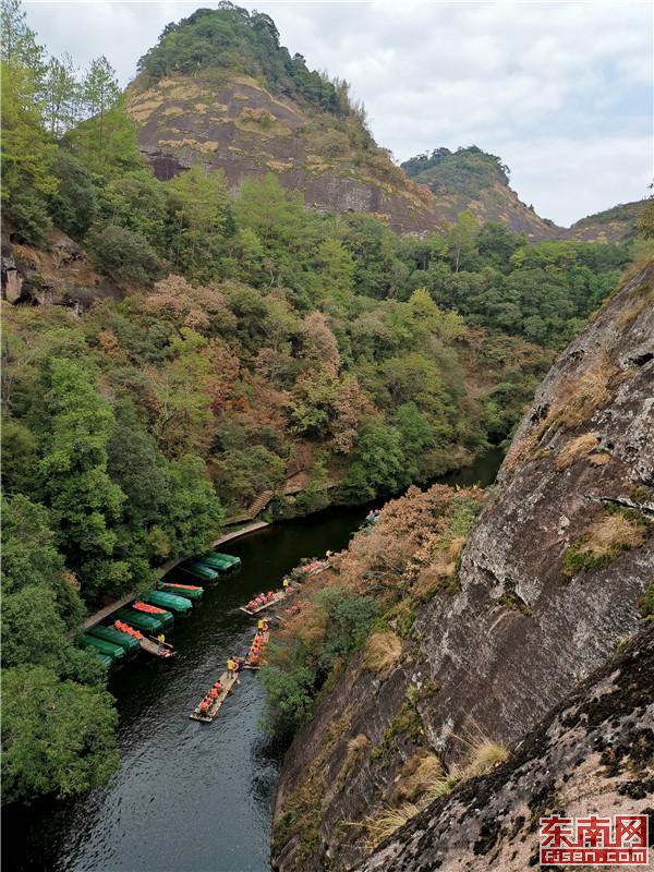 时下,泰宁县丹山如染,秋色斑斓,让八方游客沉醉其中,乐不思归。近年来,泰宁县立足丹霞田园风光、原生态森林景观、厚重历史文化底蕴等优势,着力打造“养心、养生”为主题的文旅康养项目,为泰宁发展文旅康养产业、实施乡村振兴战略带来新的机遇,同时也为实现生态“高颜值”、发展“高质量”奠定坚实基础。图为游客在九龙潭景区游览丹霞秋色。福建日报 邱灿旺 摄影报道
